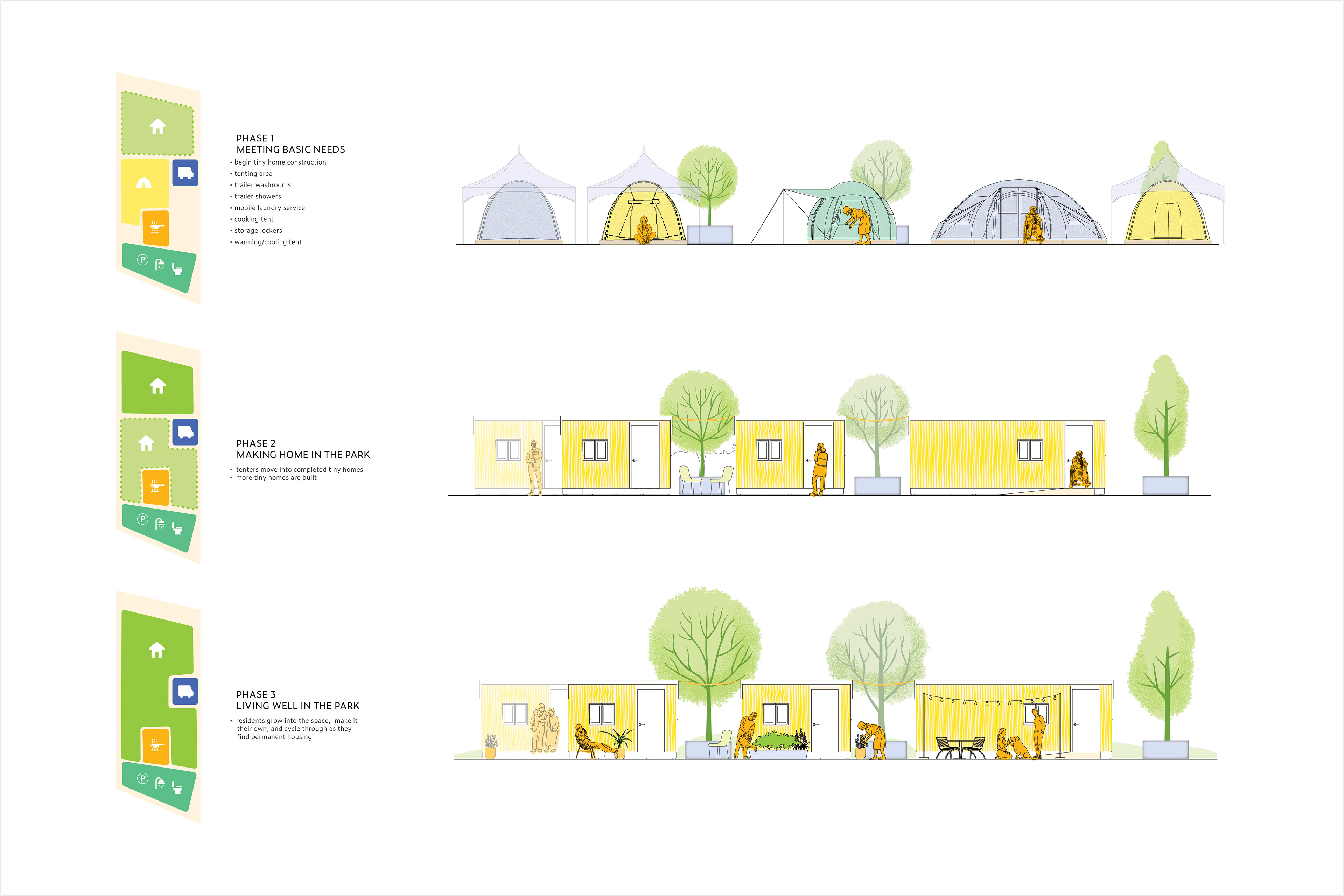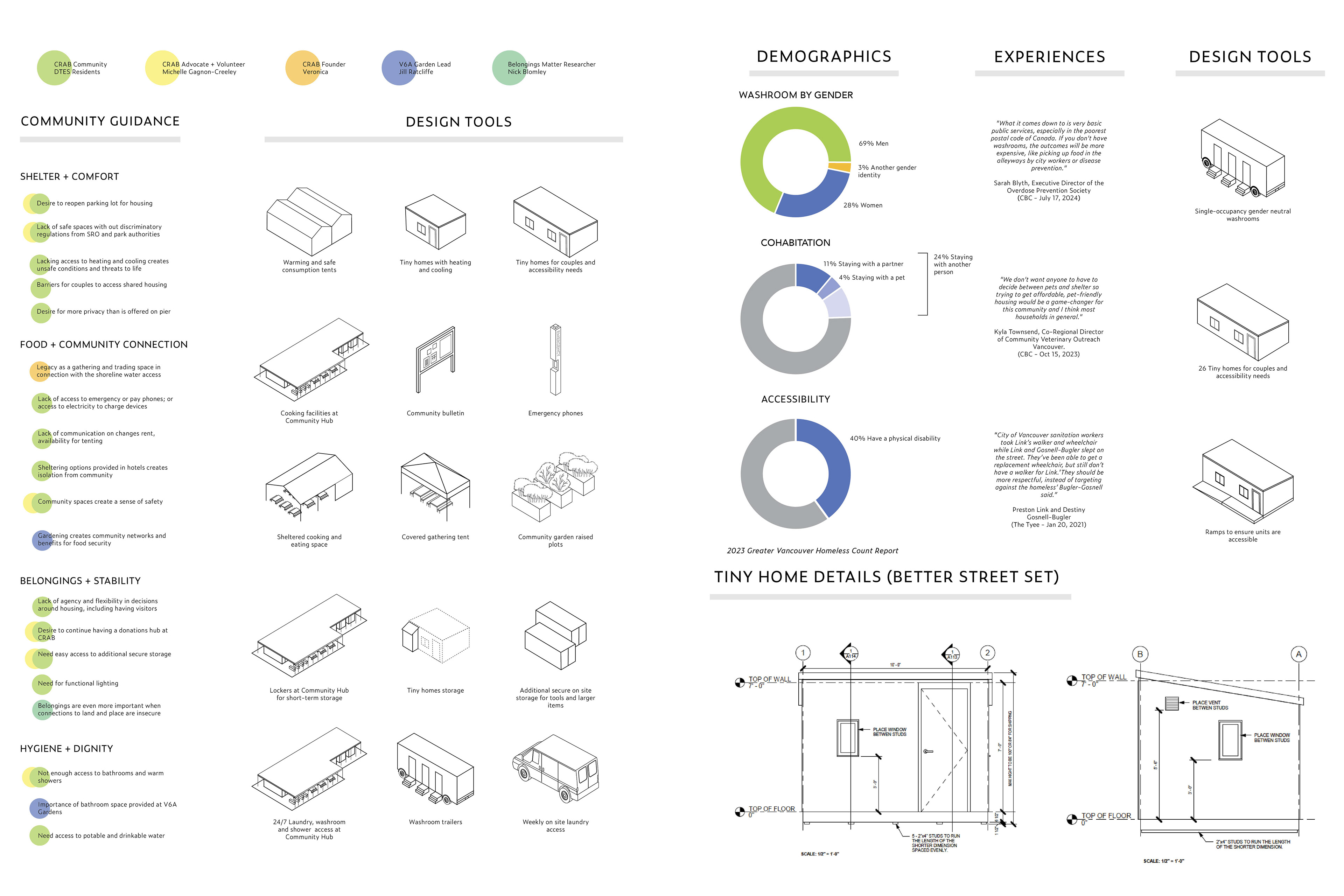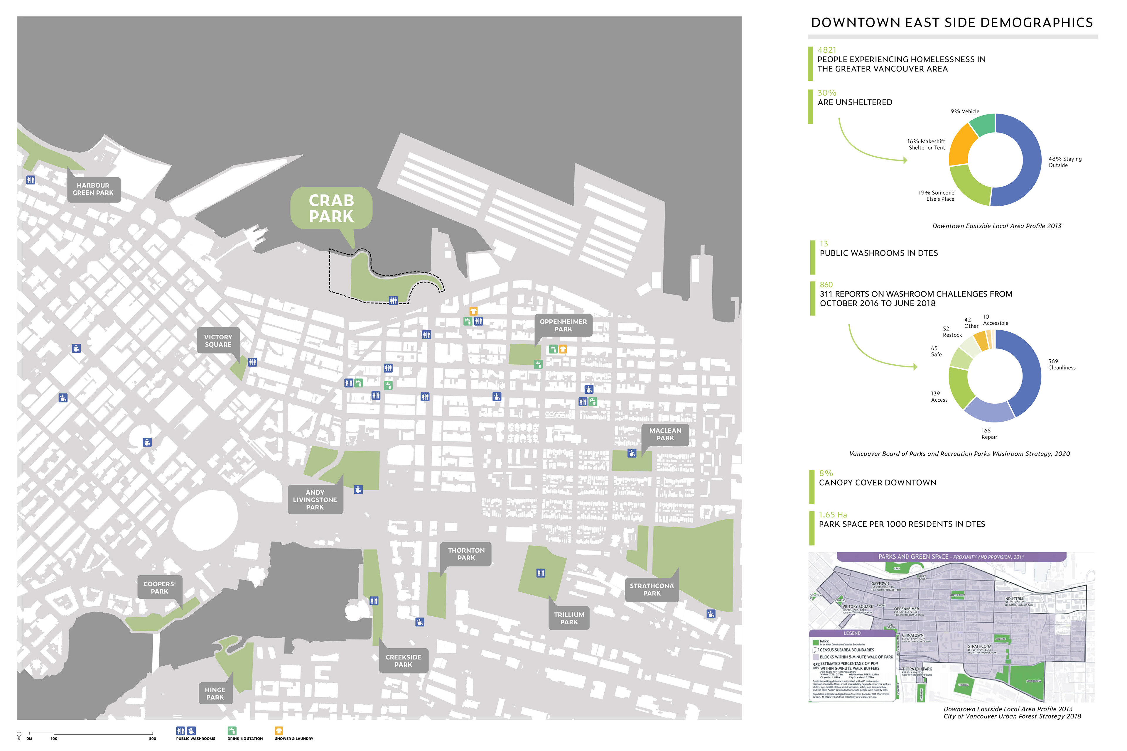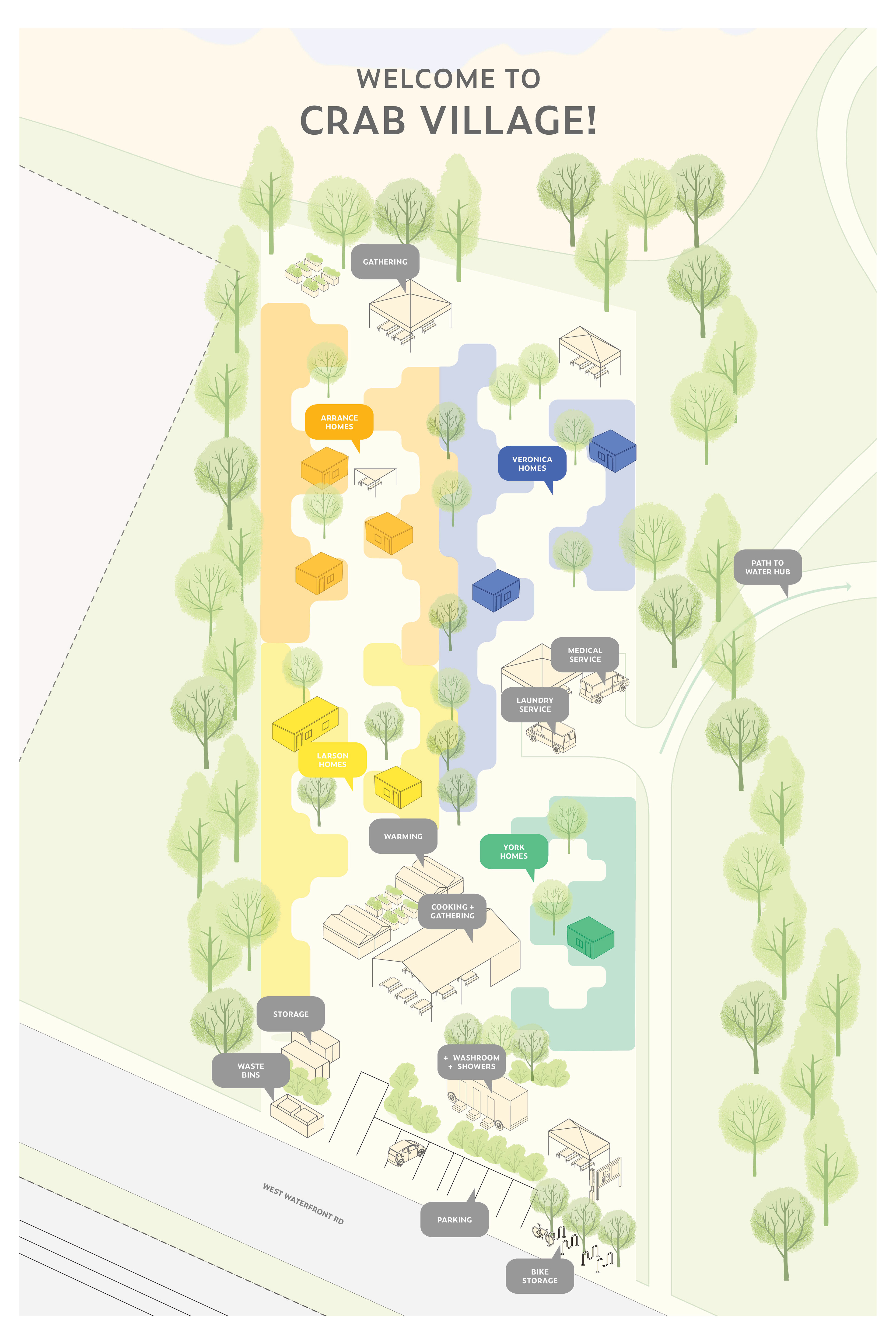 This project was completed in response to the design prompt, "To imagine that CRAB Park is to remain Canada's only legal daytime sheltering space, and that all entities which govern CRAB Park are supportive of a portion of the park becoming a community space for living and survival."