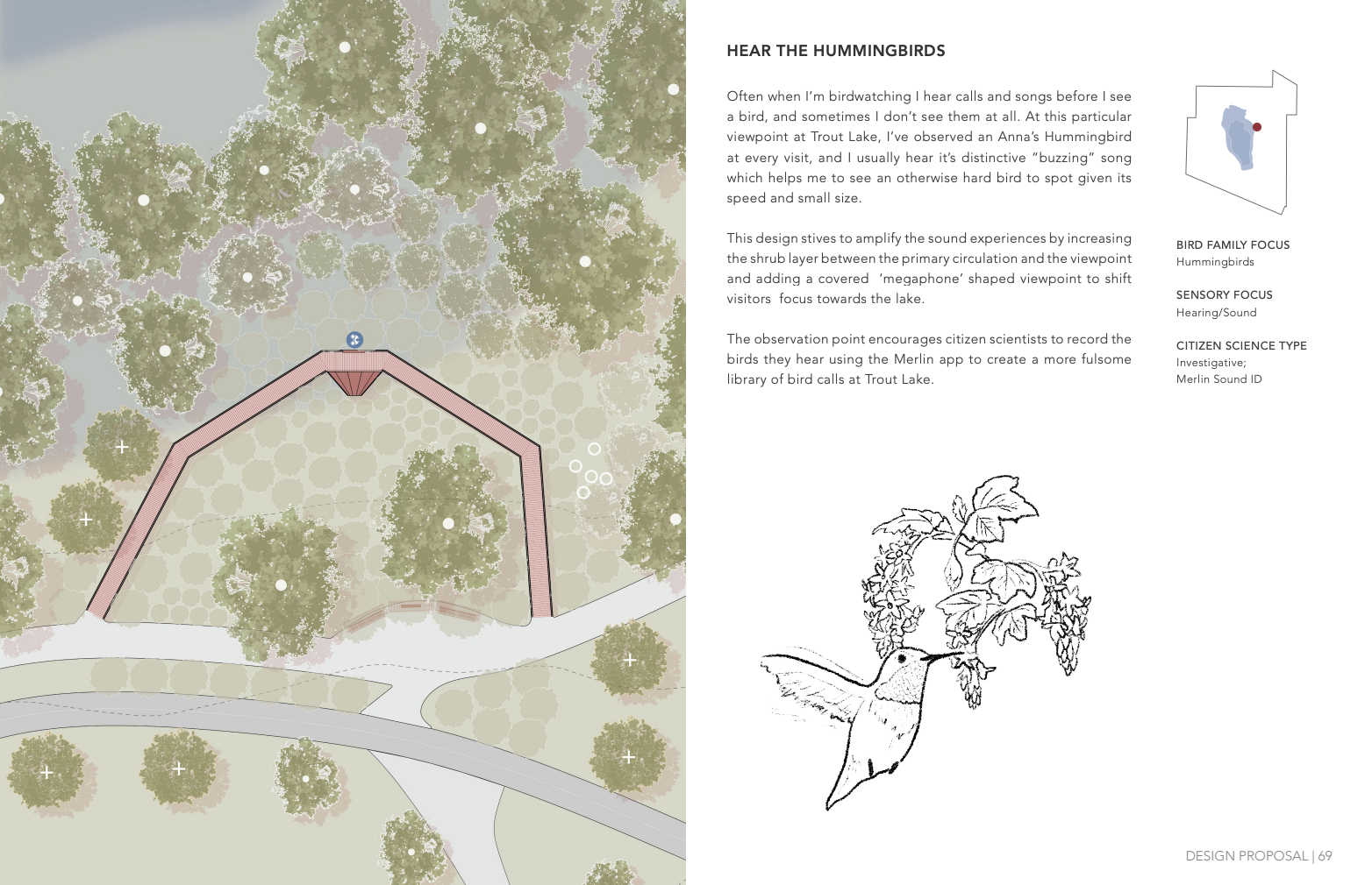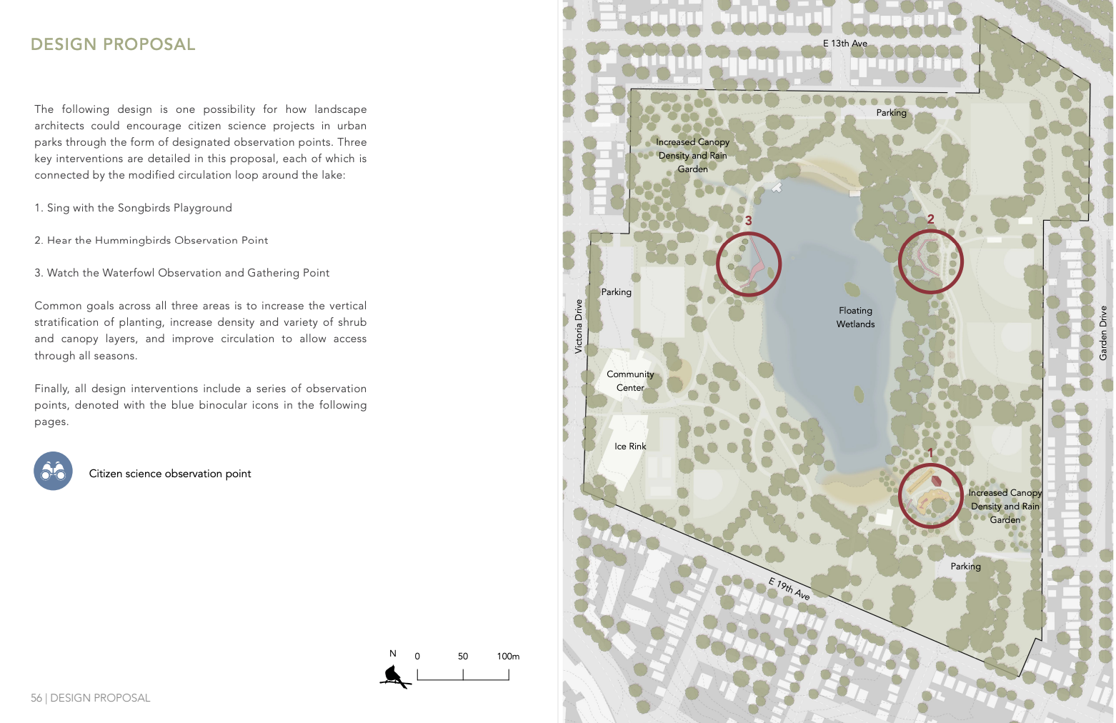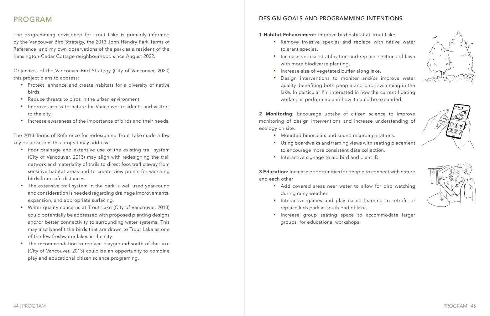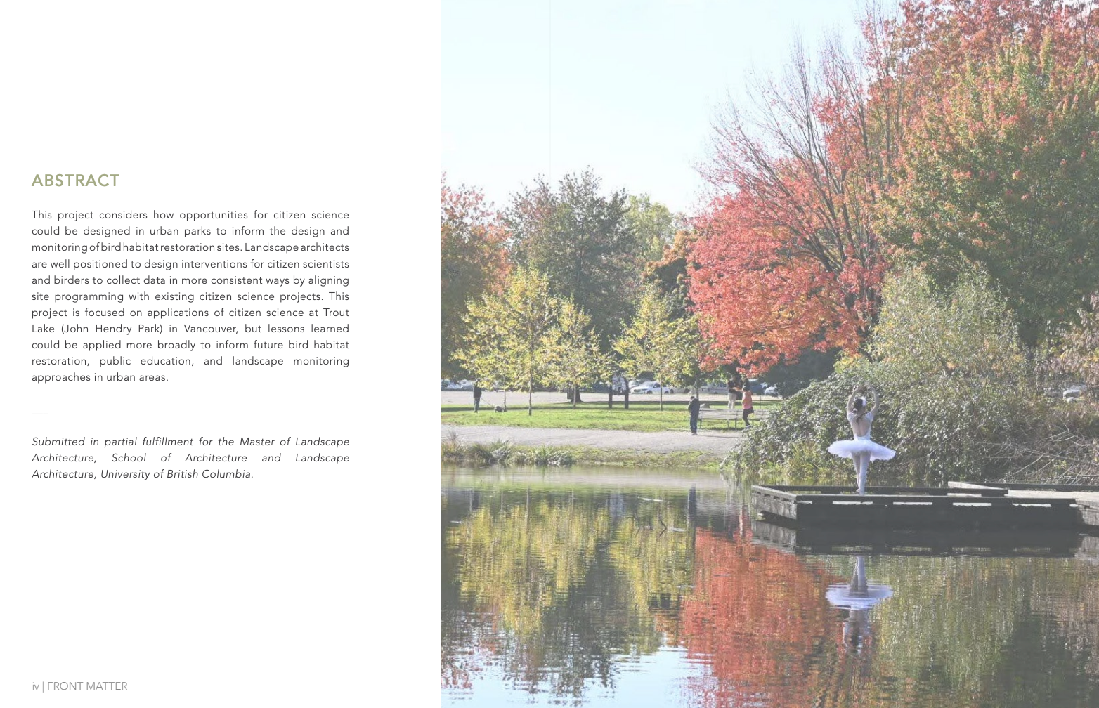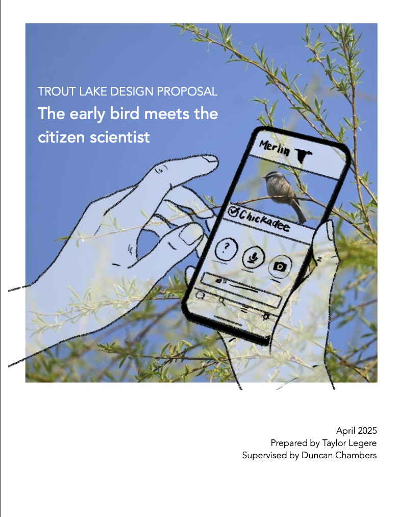 Created layout, design work, illustrations, and writing for graduate project, The early bird meets the citizen scientist, a design proposal for Trout Lake, Vancouver, BC. Read the abstract and learn more about the design process.