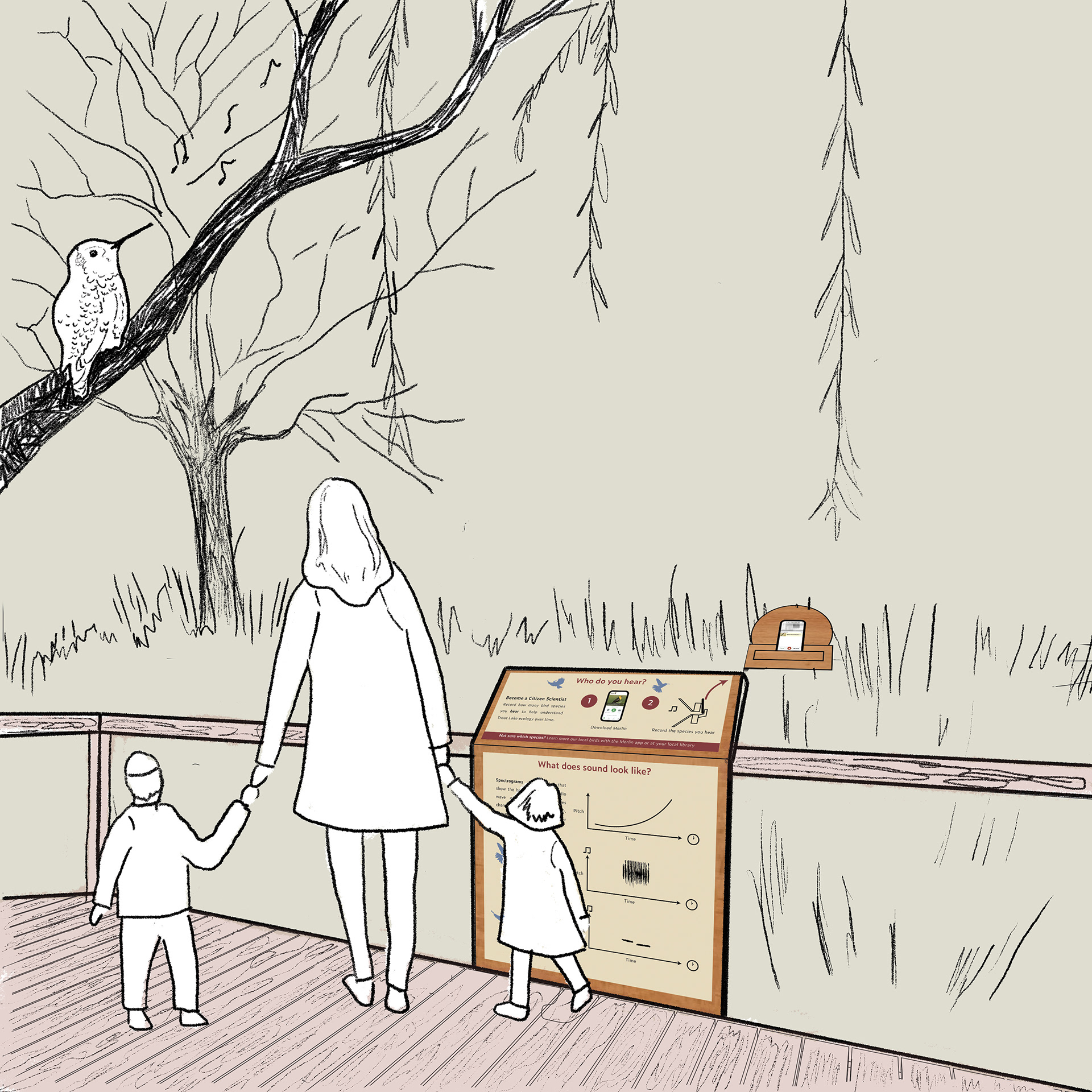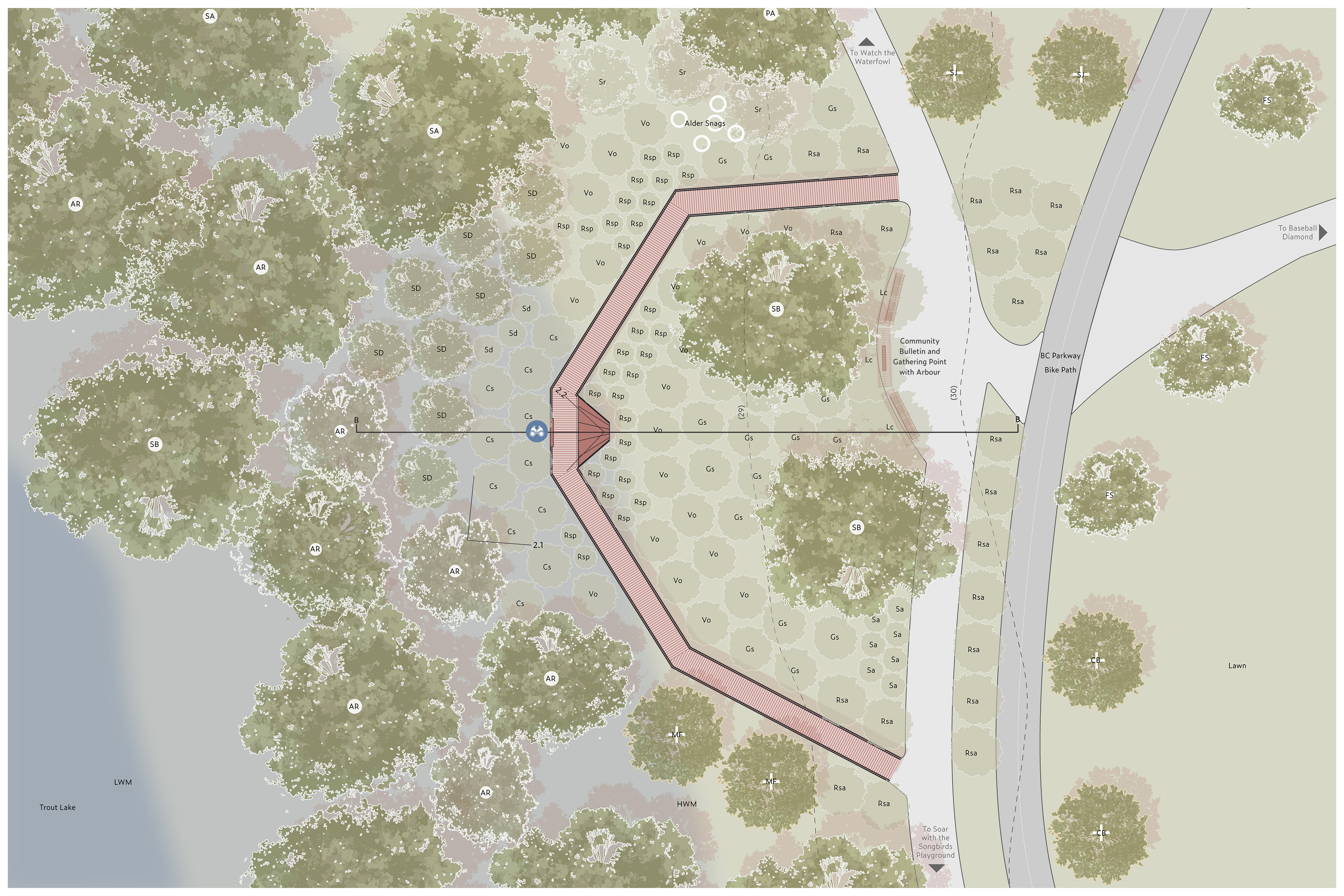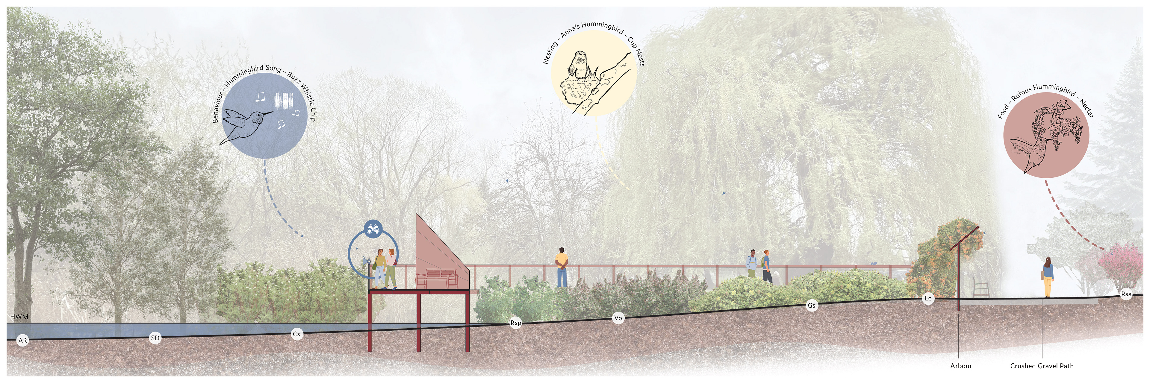 Often when I’m birdwatching I hear calls and songs before I see a bird, and sometimes I don’t see them at all. At this particular viewpoint at Trout Lake, I’ve observed an Anna’s Hummingbird at every visit, and I usually hear it’s distinctive “buzzing” song which helps me to see an otherwise hard bird to spot given its speed and small size. This design strives to amplify the sound experiences by increasing the shrub layer between the primary circulation and the viewpoint and adding a covered ‘megaphone’ shaped viewpoint to shift visitors focus towards the lake. The observation point encourages citizen scientists to record the birds they hear using the Merlin app to create a more fulsome library of bird calls at Trout Lake.