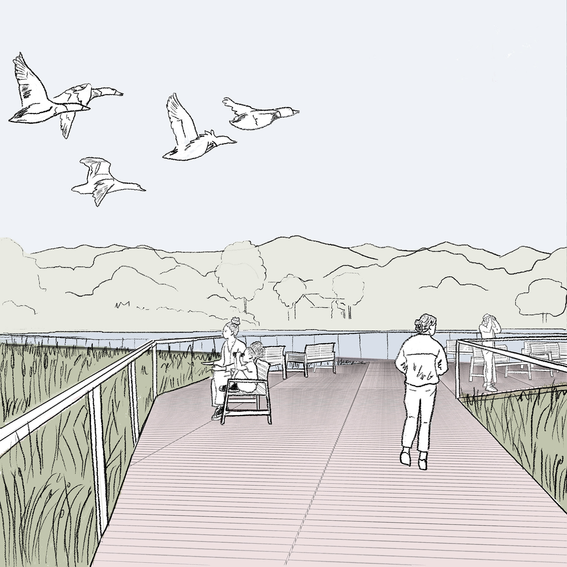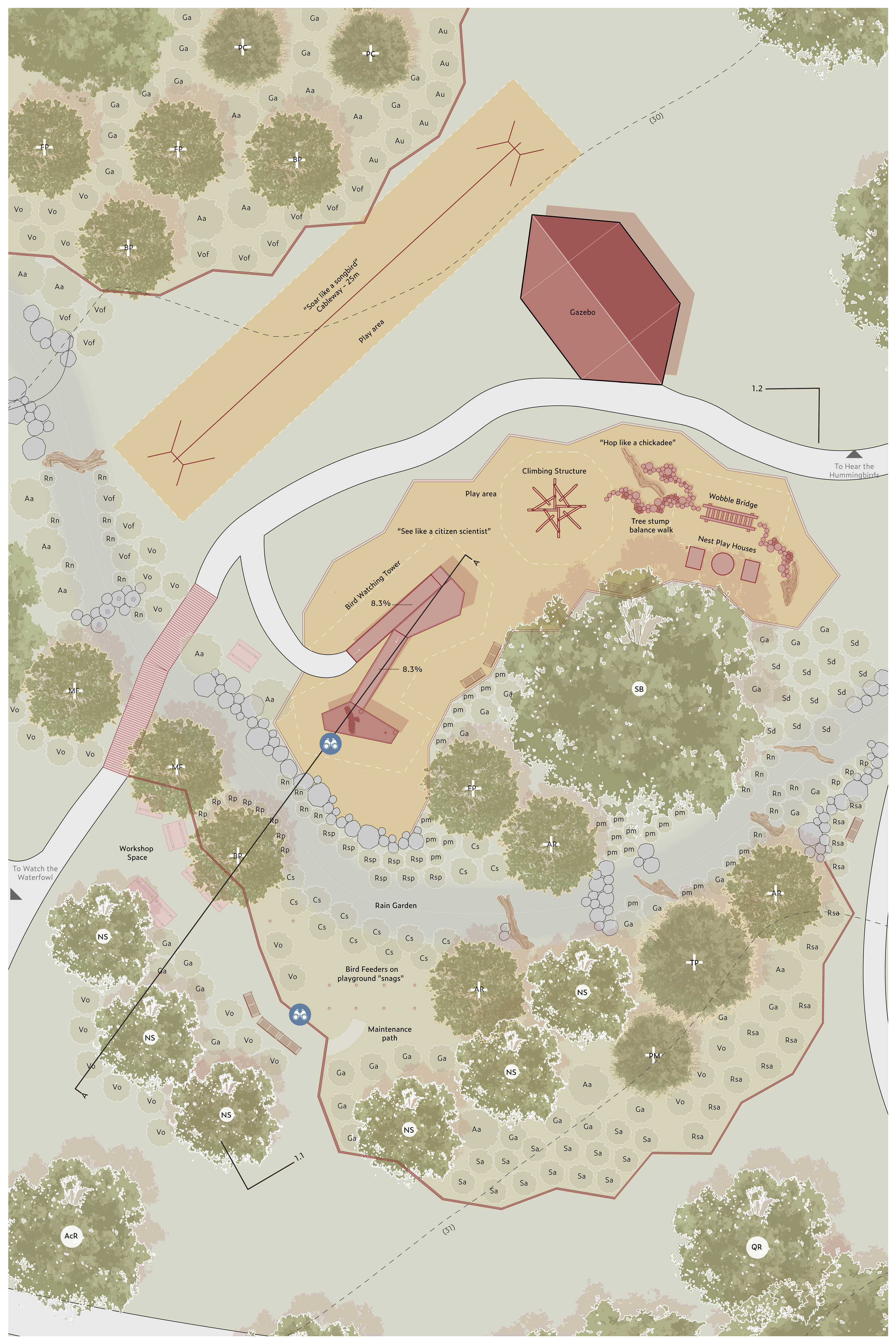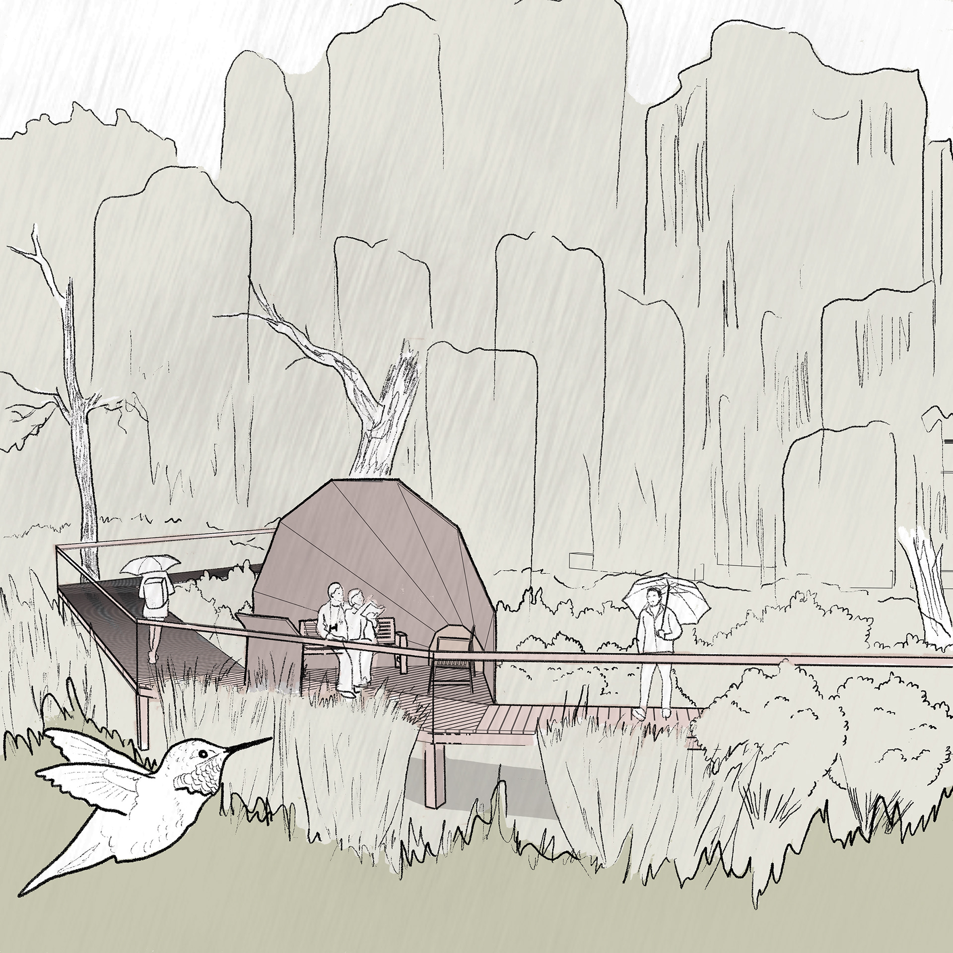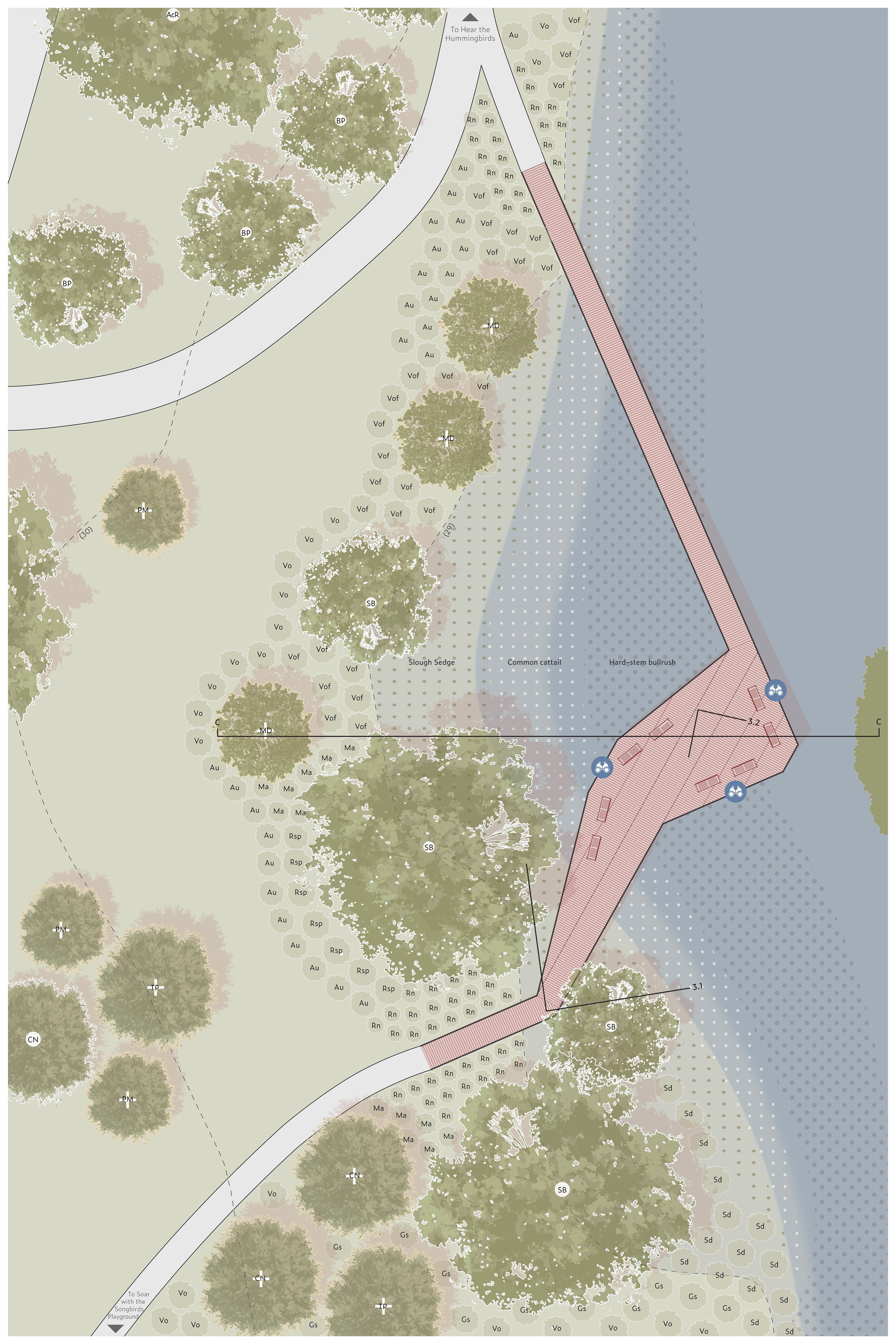 Often when I’m birdwatching I hear calls and songs before I see a bird, and sometimes I don’t see them at all. At this particular viewpoint at Trout Lake, I’ve observed an Anna’s Hummingbird at every visit, and I usually hear it’s distinctive “buzzing” song which helps me to see an otherwise hard bird to spot given its speed and small size. This design strives to amplify the sound experiences by increasing the shrub layer between the primary circulation and the viewpoint and adding a covered ‘megaphone’ shaped viewpoint to shift visitors focus towards the lake. The observation point encourages citizen scientists to record the birds they hear using the Merlin app to create a more fulsome library of bird calls at Trout Lake.